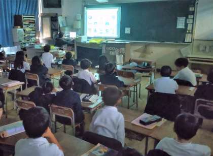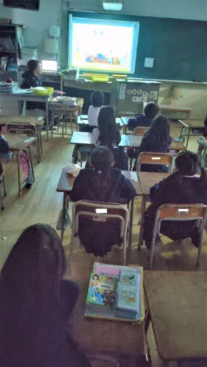 今朝も1年生の教室からアルファベットの元気な歌声が聴こえてきました。映像に合わせて歌などで英語に慣れ親しんでいます。