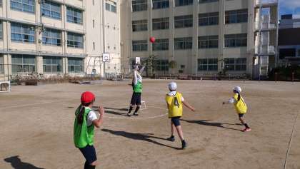4年生が体育でポートボールのゲームに取り組んでいます。チームで声をかけあってパスを回しています。