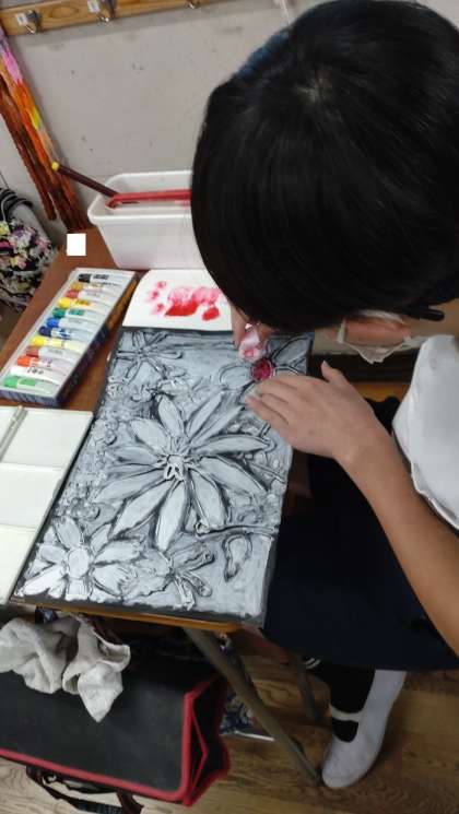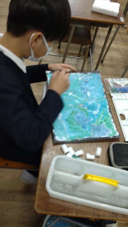 図工で「ステンシル版画」に取り組んでいます。色付けの段階で、子どもたちは、とても丁寧に色付けをしています。