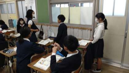 英語で、小学校生活の思い出に残る行事を伝え合う言語活動をしました。上段の写真は、子どもたちが、基本表現の What's your best memory? My best memory is ....を使って、友だちと伝え合っている様子です。