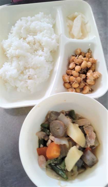 今日の給食は、鶏肉と野菜の煮もの、じゃこ豆、かぶのゆず風味、ごはん、牛乳です。