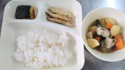 今日の給食は、きびなごのてんぷら、含め煮、焼きかぼちゃの甘みつかけ、ごはん、牛乳です。