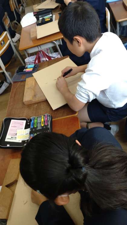 4年生が木版画に取り組んでいます。この時間は、彫刻刀の安全な使い方を学びました。