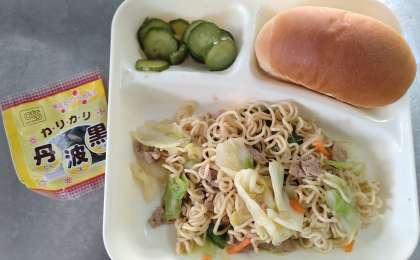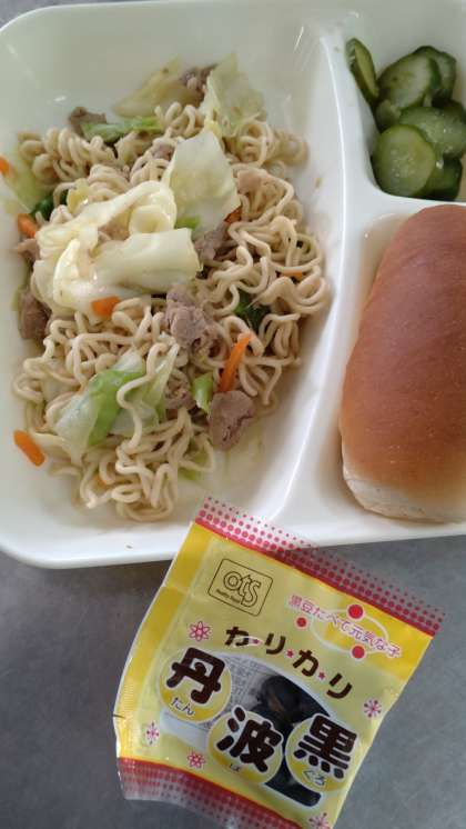 今日の給食は、和風焼きそば、きゅうりのしょうがづけ、いり黒豆、黒糖パン1/2、牛乳です。2学期最後の給食となります。