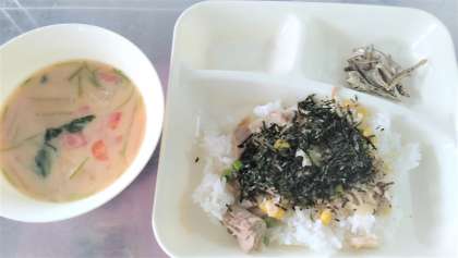 新学期、今日から給食がはじまりました。今日の給食は、【正月の行事献立】で、れんこんのちらしずし、ぞう煮、ごまめです。