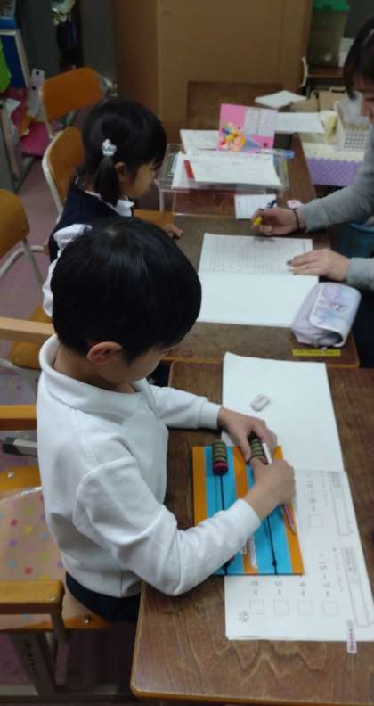 なかよし学級で、ひらがなや漢字、算数のひき算など、それぞれの課題に取り組んでいます。ひらがなの復習や新出漢字、2ケタ−1ケタのひき算などの学習しています。