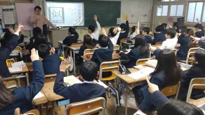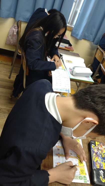 5年生が国語の時間に、漢字の学習に取り組んでいます。新出漢字の「似」や「基」など、書き順や熟語などを学んでいます。