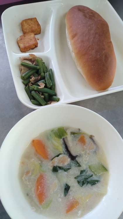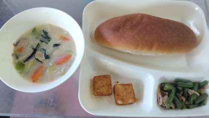 昨日、1月11日(木)の給食は、はくさいのクリーム煮、あつあげのピリ辛じょうゆかけ、豚肉とさんどまめのオイスターソースいため、黒糖パン、牛乳でした。