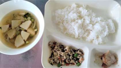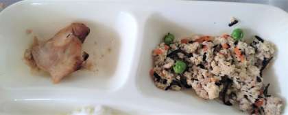 今日の給食は、鶏肉の甘みそ焼き、五目汁、高野どうふのいり煮、ごはん、牛乳です。