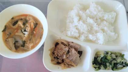 今日の給食は、豚肉のごまだれ焼き、みそ汁、きくなとはくさいのおひたし、ごはん、牛乳です。