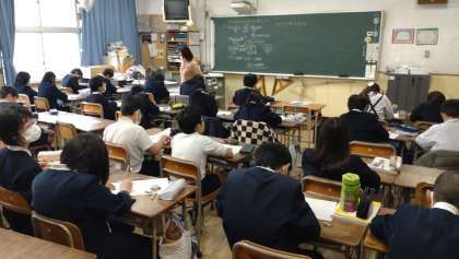 5年生が算数と国語の学習に取り組んでいます。上段の写真は、算数で、もとのねだんの求め方を考える学習の様子です。下段の写真は、「熟語をつかおう」の学習で、熟語の構成について学んでいる様子です。