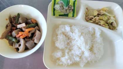 今日の給食は、筑前煮、ツナとキャベツのごまいため、まっ茶大豆、ごはん、牛乳です。