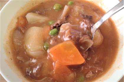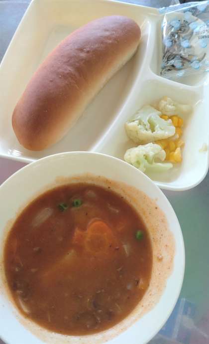 今日の給食は、ビーフシチュー、カリフラワーとコーンのサラダ、ミニフィッシュ、黒糖パン、牛乳です。