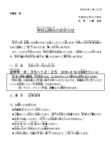1月24日(水)、今日は、学校公開日です。子どもたちの普段通りの学習の様子を見ていただければと思います。たくさんの保護者の皆様の徒歩でのご来校お待ちしています。下記に既に配布している案内を再掲しますので注意事項等のご確認をよろしくお願いします。