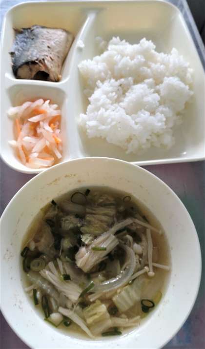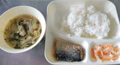 今日の給食は、さばのみそ煮、すまし汁、紅白なます、ごはん、牛乳です。