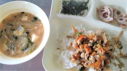 今日の給食は、鶏ごぼうご飯、みそ汁、焼きれんこん、牛乳です。