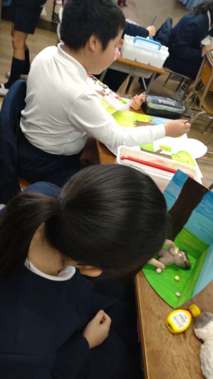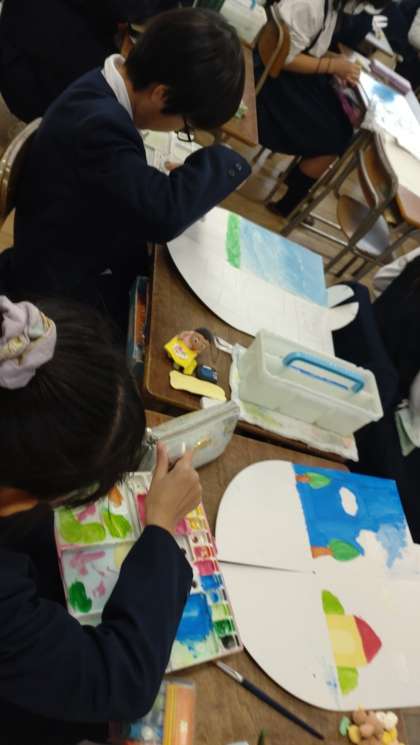 4年生が作品展に向けて、立体工作づくりに取り組んでいます。色合いを工夫しながら丁寧に彩色しています。