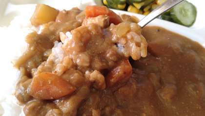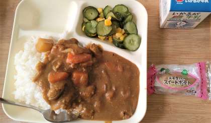 今日の給食は、チキンレバーカレーライス、きゅうりとコーンのサラダ、スイートポテト、牛乳です。