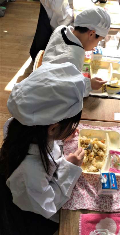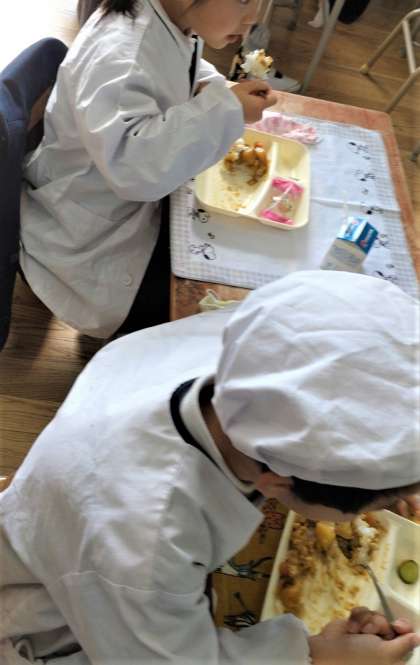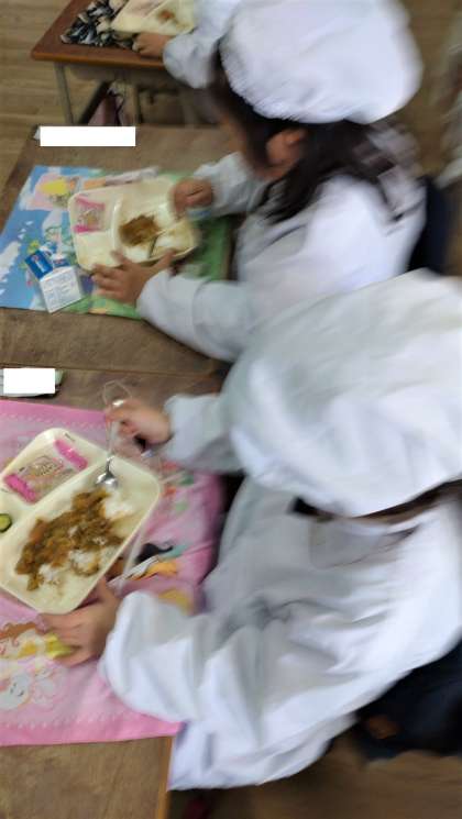 写真は、給食の時間の1年生の子どもたちの様子です。今日は、大好きなカレーライス。楽しそうに給食を食べています。