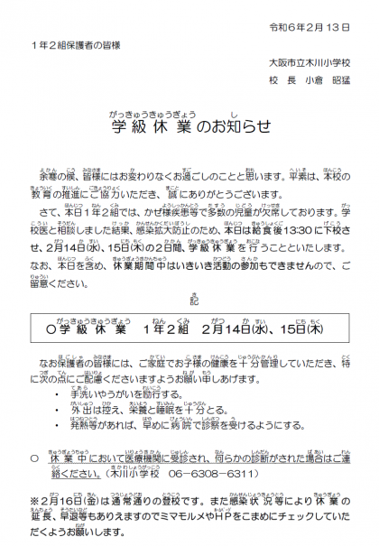 本日給食後下校(13:30)のため、教室までお迎えをお願い致します。また、14日、15日はお休みです。