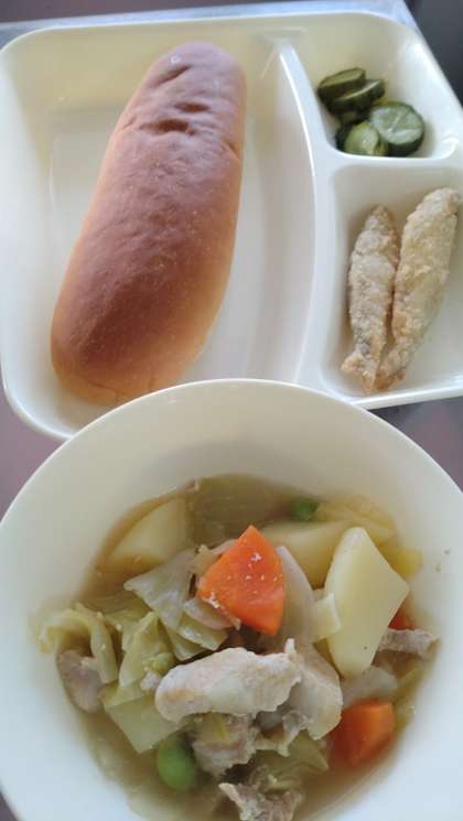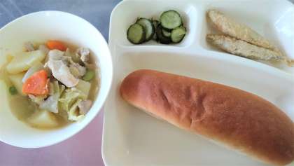 今日の給食は、わかさぎフライ、洋風煮、きゅうりのピクルス、黒糖パン、牛乳です。