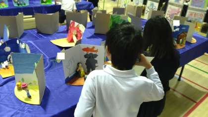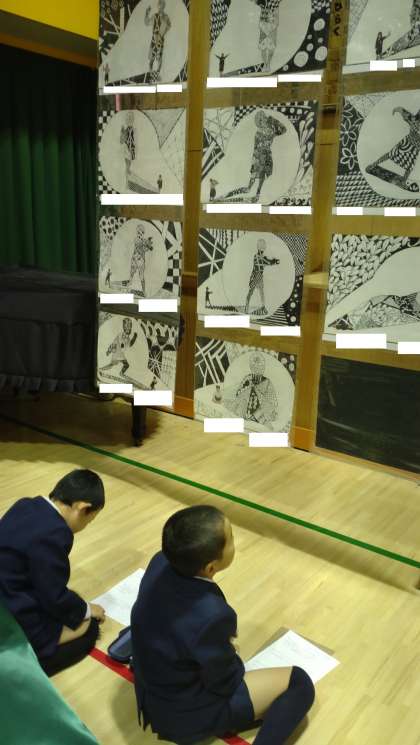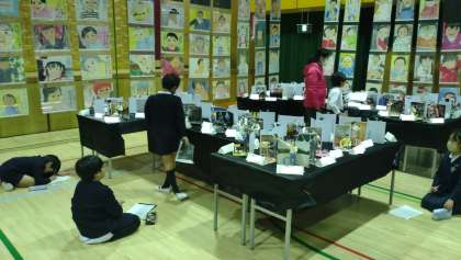 作品搬入も終わり、今日は、学年ごとに作品展を鑑賞しています。写真は、作品を鑑賞する3年生の子どもたちの様子です。鑑賞の感想をワークシートにしっかりと書いています。