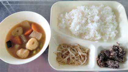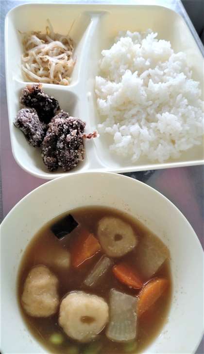 今日の給食は、くじらのたつたあげ、まる天と野菜の煮もの、もやしのしょうがづけ、ごはん、牛乳です。