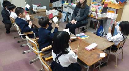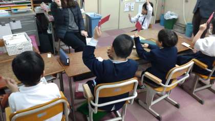 写真は、旗上げゲームをする子どもたちの様子です。しっかりと出題する先生や友だちの言葉を聞いて旗を上げることが大切です。子どもたちは、ゲームの中で相手の言葉を最後までしっかりと聞くことを学んでいます。
