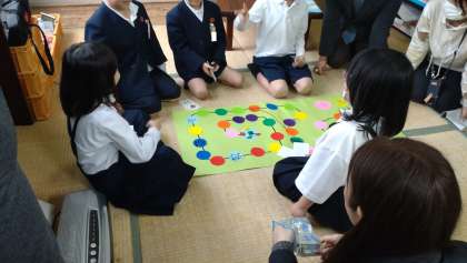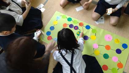 写真は、言葉すごろくに取り組んでいる様子です。子どもたちが作ったすごろくを使って濁点のつく言葉を考えて言葉の数だけマスを進めるルールです。思いつかない場合は、濁点絵カードを見たり、おたすけカードで先生に聞いたりして、言葉を学びながら、すごろくを楽しみました。