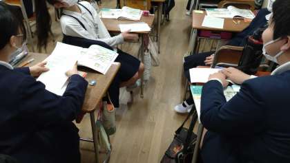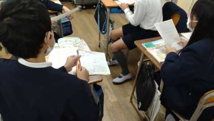 6年生が家庭科で「共に生きる地域での生活」について学習しています。この時間は、家庭生活は人々との関わりで成り立っていることを知り、地域の人々との協力が大切であることを学んでいます。中下段の写真はペアやグループで話し合っている様子です。