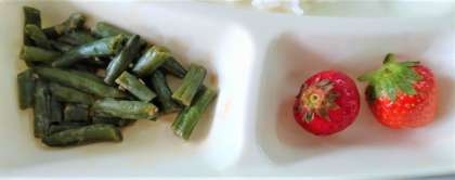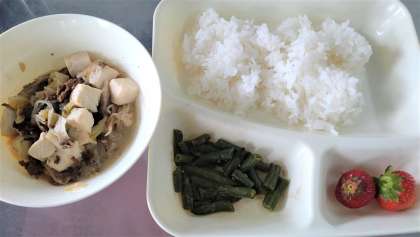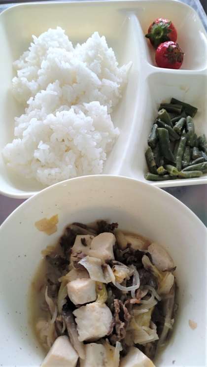 今日の給食は、すき焼き煮、さんどまめのごまあえ、いちご、ごはん、牛乳です。