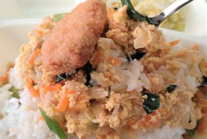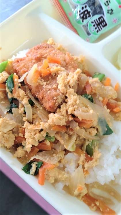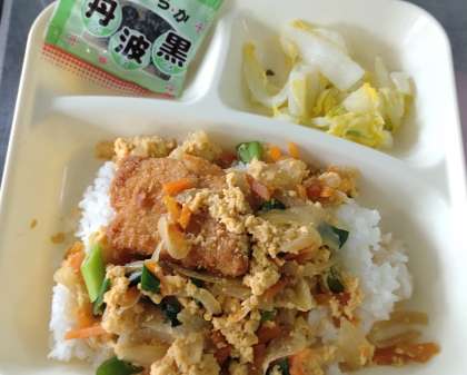 今日の給食は、かつ丼、はくさいの甘酢あえ、ソフト黒豆、牛乳です。
