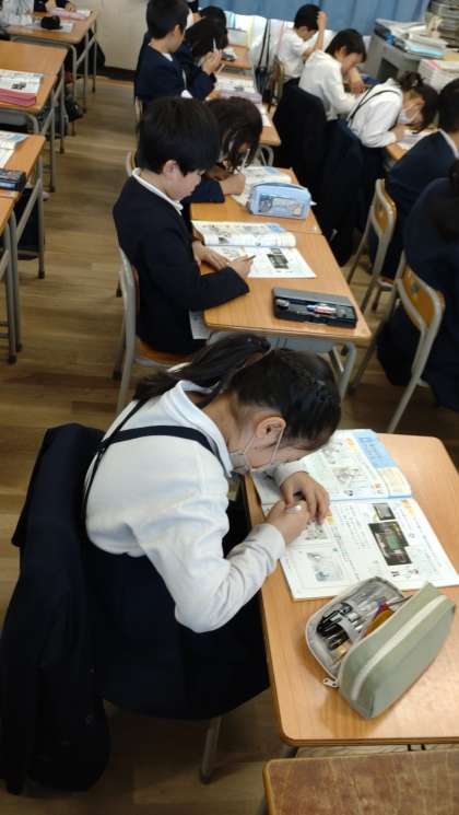 教科書のふたつの場面(清掃・テレビ視聴)の改善点を熱心に書いています。この時間の学習のまとめとして、普段から生活の仕方や生活環境を整えることなど、多くの意見が子どもたちから発表されました。