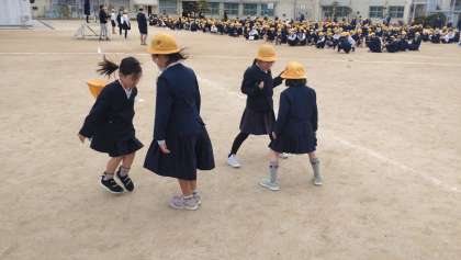 子どもたちは、運動場をいっぱいに使って元気にゲームをしています。上段の写真は見本を見せる子どもたちの様子です。