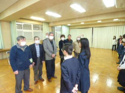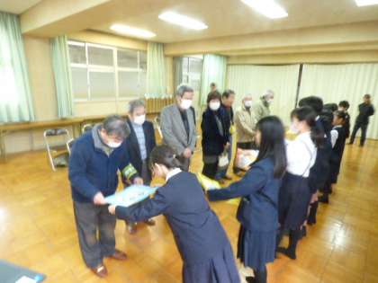 本日の全校朝会は「見守り活動ありがとう集会」でした。毎日の登下校を見守ってくださっている地域の見守り隊の方々に感謝の意を表する集会です。見守り隊を代表して来校された方々に代表委員の児童が感謝を述べ、各学級で書いた手紙を贈りました。
