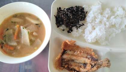 今日の給食は、いわしフライ、みそ汁、牛ひじきそぼろ、ごはん、牛乳です。