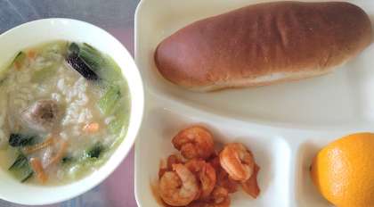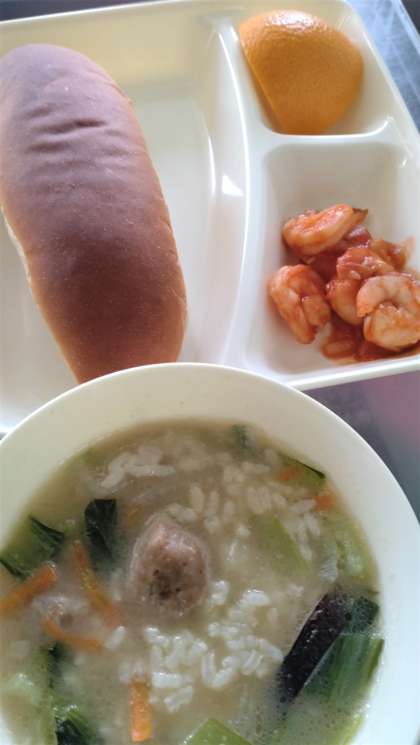今日の給食は、えびのチリソース、中華がゆ、はっさく、黒糖パン、牛乳です。