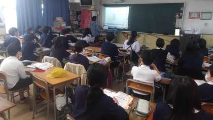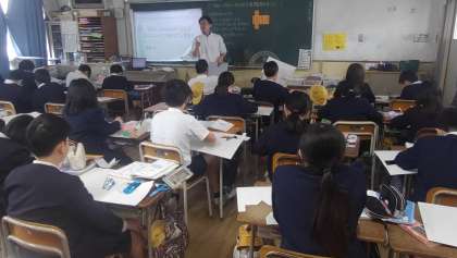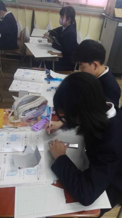 5年生が算数で「角柱と円柱」の学習に取り組んでいます。この時間は、角柱の展開図のかき方を理解して、展開図を組み立てて角柱をつくっています。