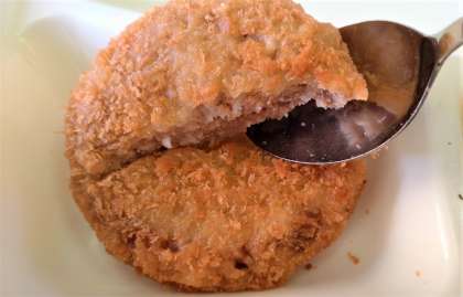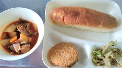 今日の給食は、チキンレバーカツ、ケチャップ煮、ツナとキャベツのバジルソテー、おさつパン、牛乳です。本日で令和5年度の給食は終了します。