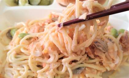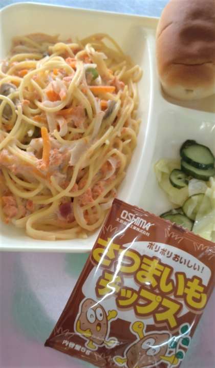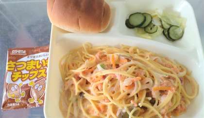 3月14日の給食は、さけのクリームスパゲッティ、キャベツときゅうりのサラダ、おさつチップス、黒糖1/2パン、牛乳です。