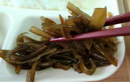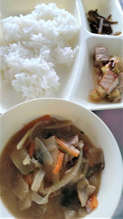 3月13日の給食は、まぐろの甘辛焼き、豚汁、くきわかめのつくだ煮、ごはん、牛乳です。