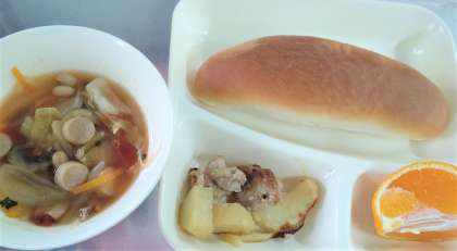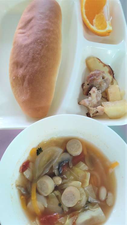3月12日の給食は、鶏肉とじゃがいものガーリック焼き、ウインナーとてぼ豆のスープ、デコポン、コッペパン、フルーベリージャム、牛乳です。