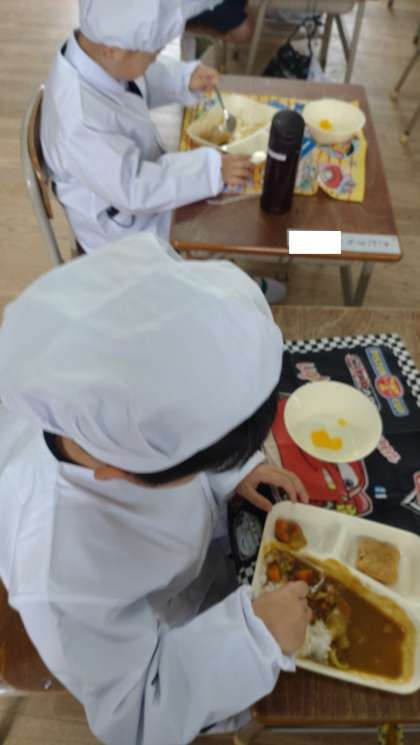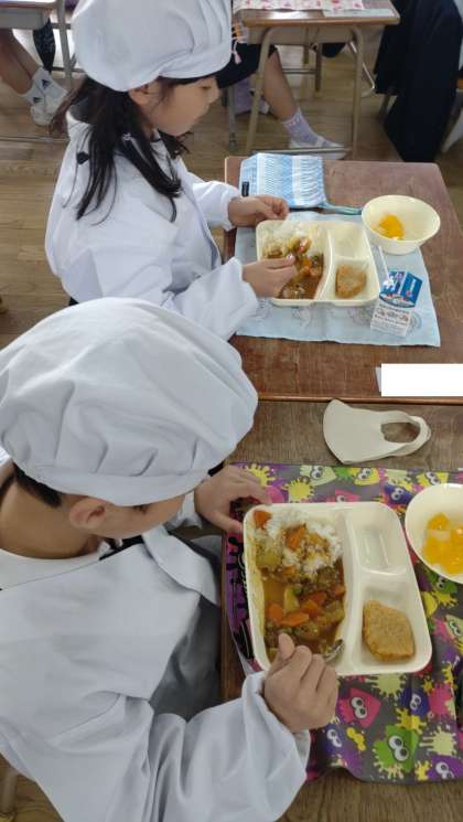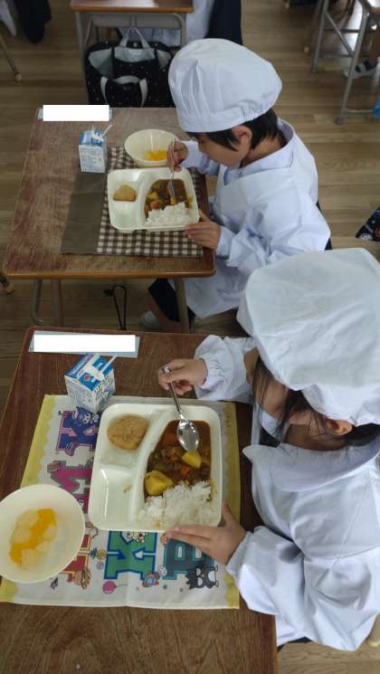 写真は、美味しそうに給食を食べる1年生の子どもたちの様子です。