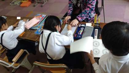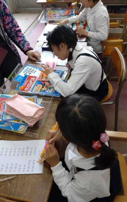 なかよし学級の2年生が算数の学習に取り組んでいます。ドリルを活用して、1年生の学習の振り返りをしています。子どもたちはとても集中して学習しています。
