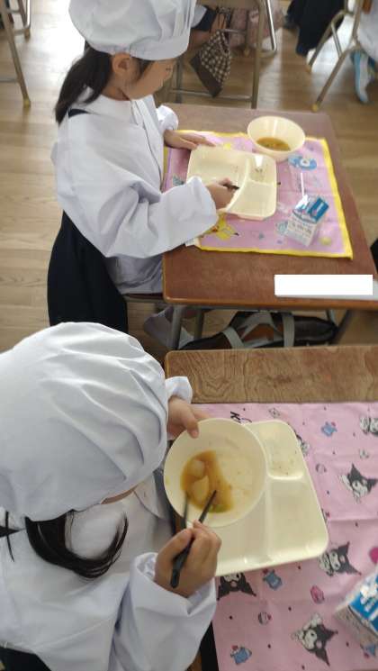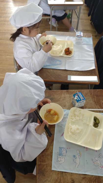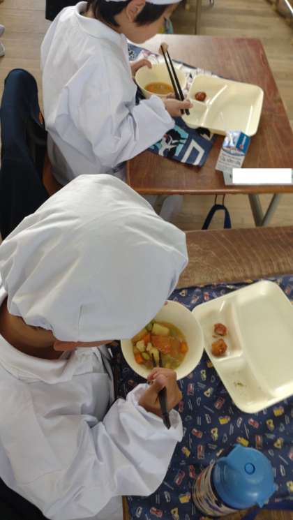 1年生の給食の様子をのぞくと子どもたちが食欲旺盛に給食を食べていました。