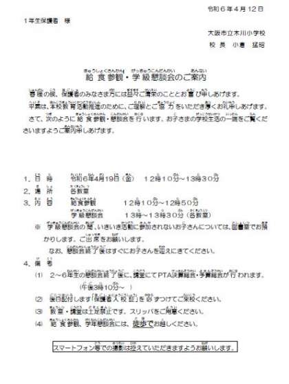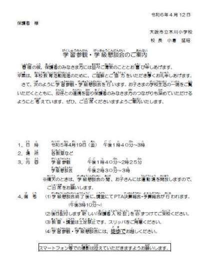本日は参観・学級懇談、PTA総会があります。たくさんの保護者の方のご来校をお待ちしてております。