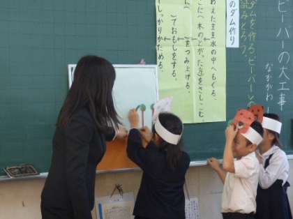 2年生の国語、説明文「ビーバーの大工事」の学習で、授業研究会を行いました。