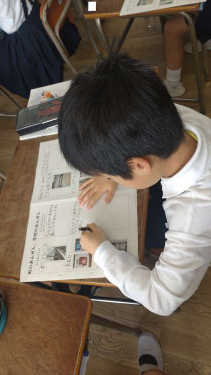 2年生が生活科の学習で「町のあんぜん 学校の安全について調べよう」の学習に取り組んでいます。ガードレールや点字ブロック、AEDなど設備や施設の役割について調べ考えています。