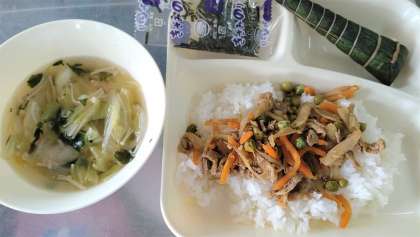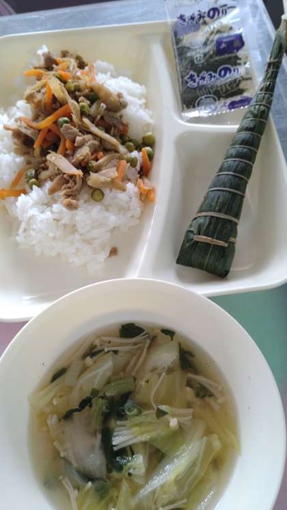 今日の給食は、きんぴらちらし、きざみのり、すまし汁、ちまき、牛乳です。