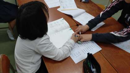 なかよし学級の3年生と5年生が国語と算数の学習に取り組んでいます。国語は、物語文の読み取り、算数では、分数の計算などの学習をしています。